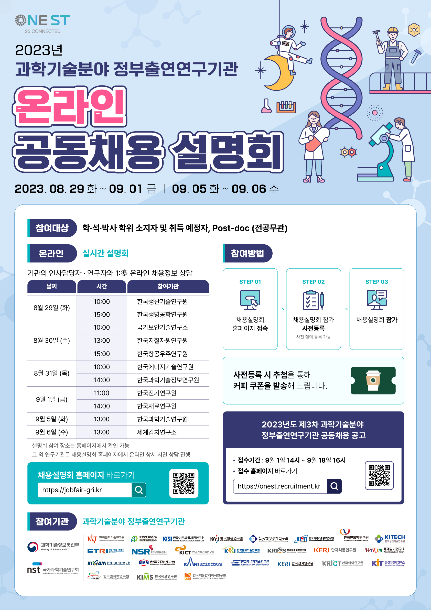 오는 8월 29일(화)~9월 6일(수)까지 온라인 출연(연) 공동채용 설명회를 개최 예정에 있습니다.