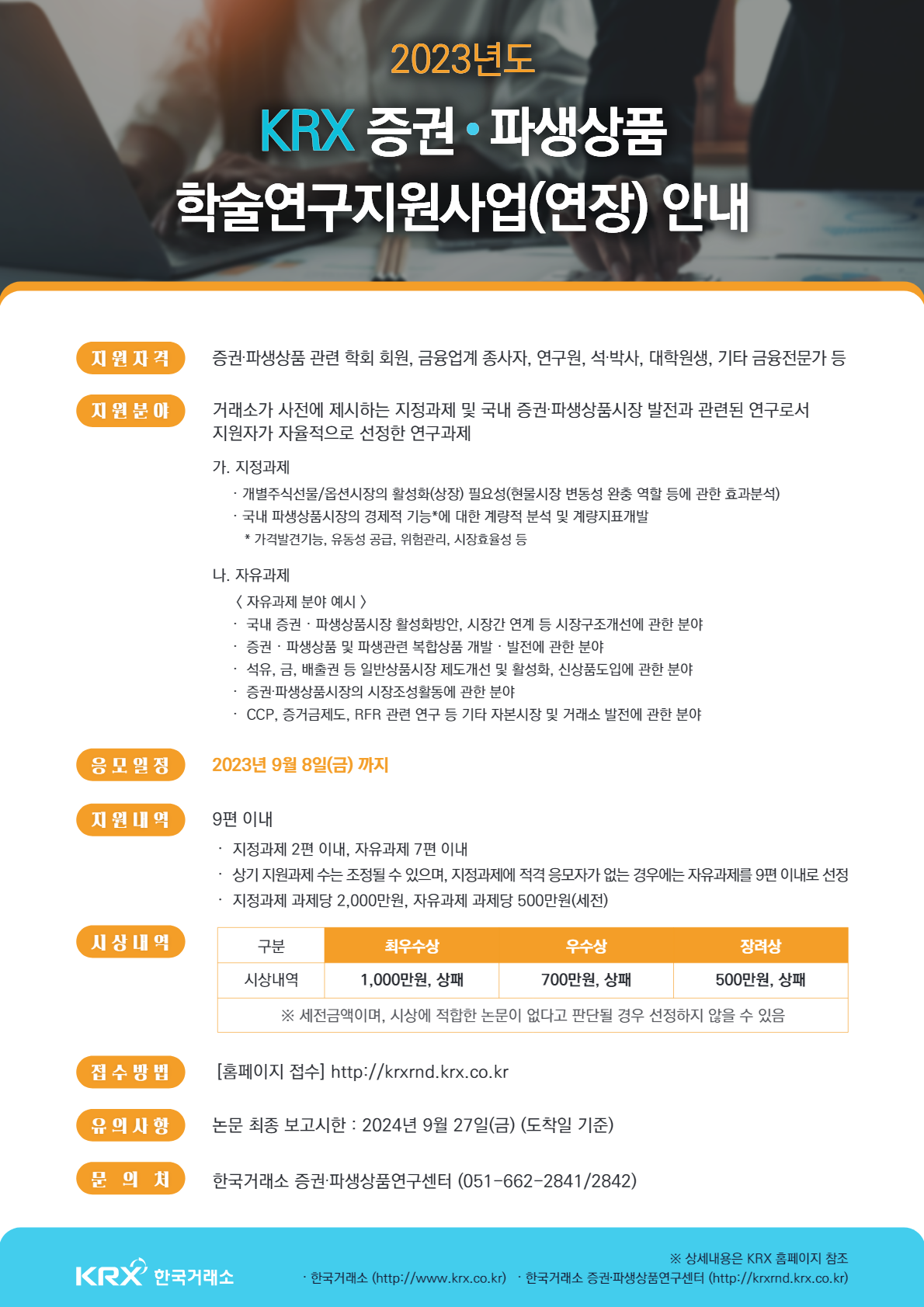 [한국거래소] 2023년도 KRX 증권/파생상품 학술연구지원사업(연장) 안내