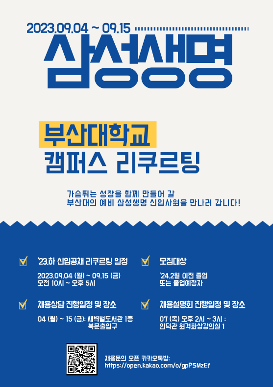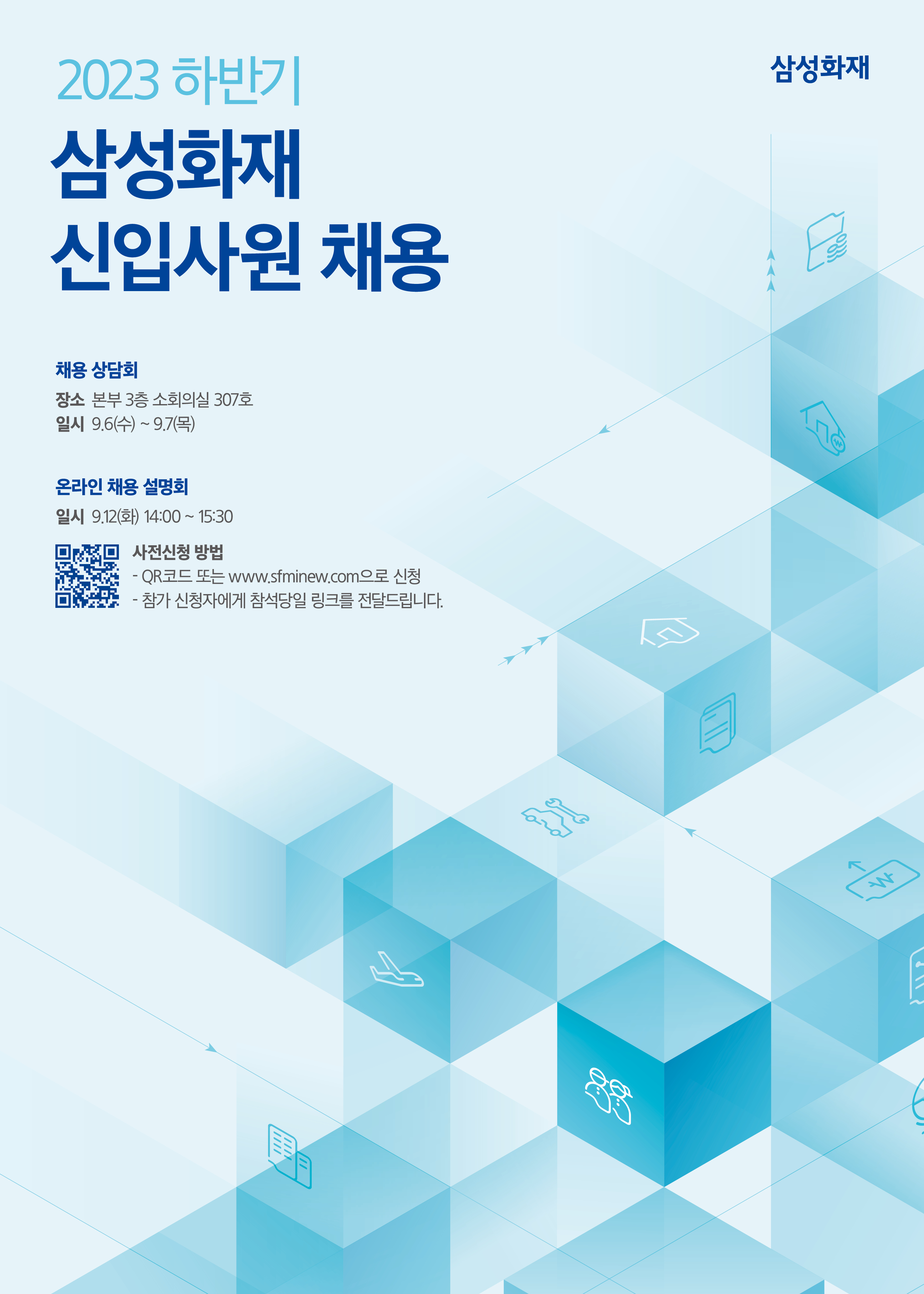 삼성생명/삼성화재 2023 하반기 채용설명회 및 상담회 일정을 아래와 같이 알려드리니, 관심 있는 학생들의 많은 참여 바랍니다.