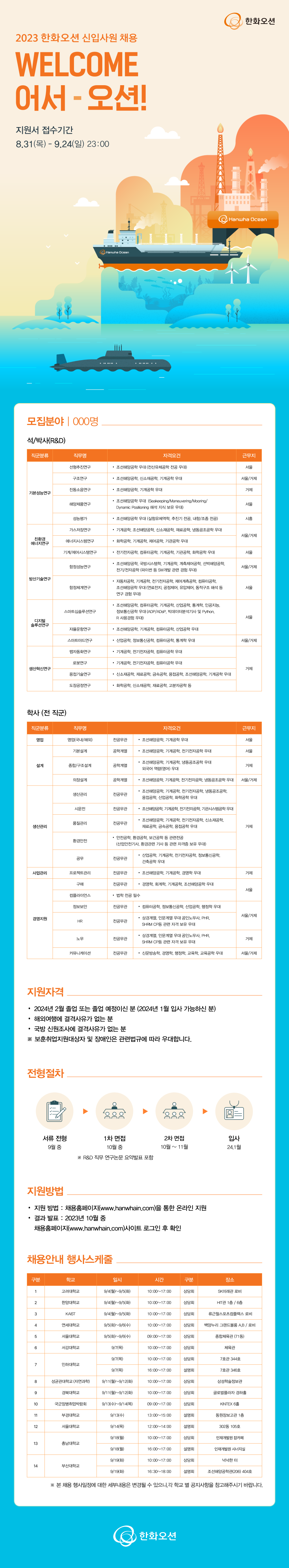 한화오션 2023 하반기 채용설명회 일정을 아래와 같이 알려드리니, 관심 있는 학생들의 많은 참여 바랍니다.