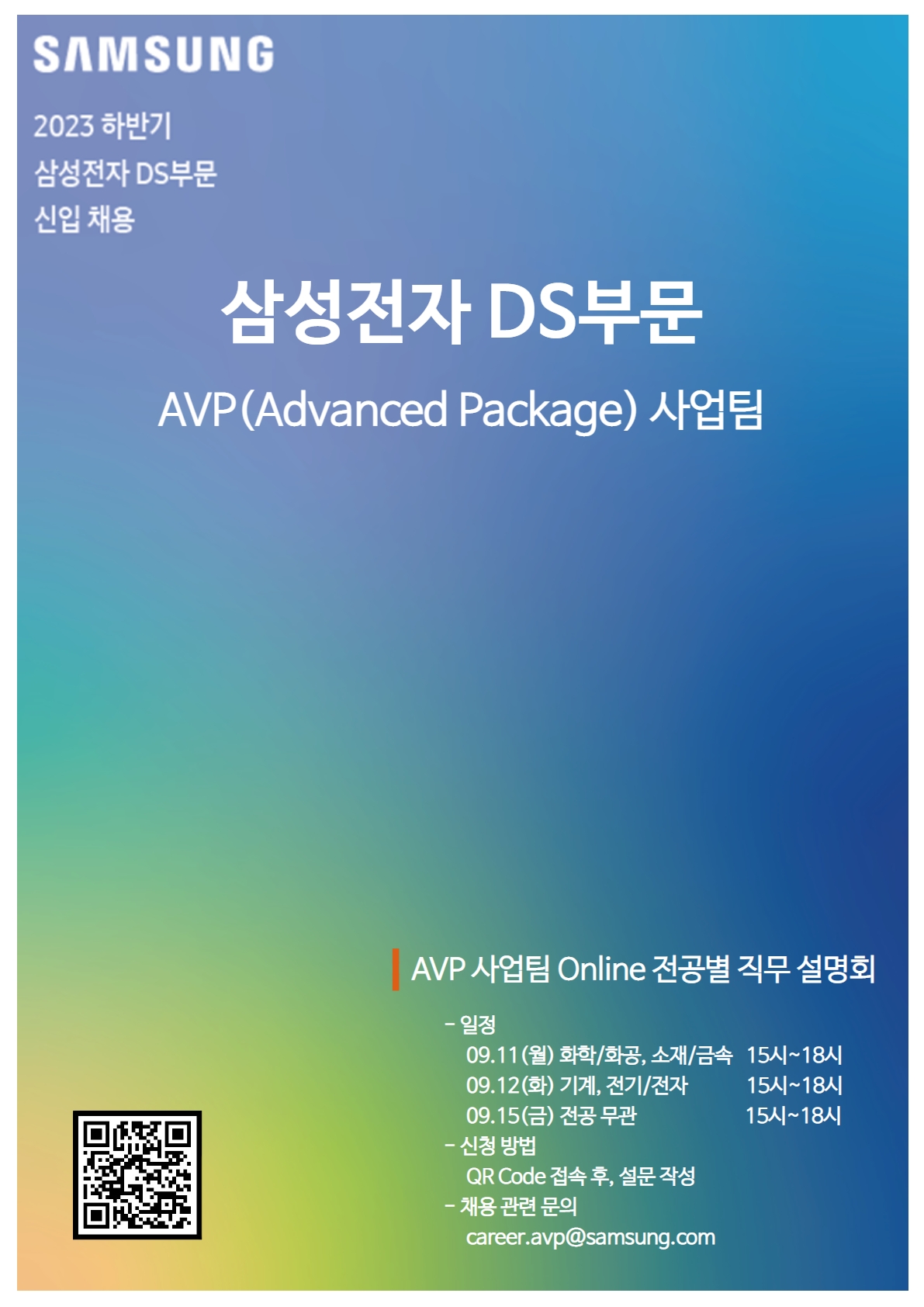 삼성전자 DS부문 AVP사업팀 2023 하반기 채용상담회 일정을 아래와 같이 알려드리니, 관심 있는 학생들의 많은 참여 바랍니다.