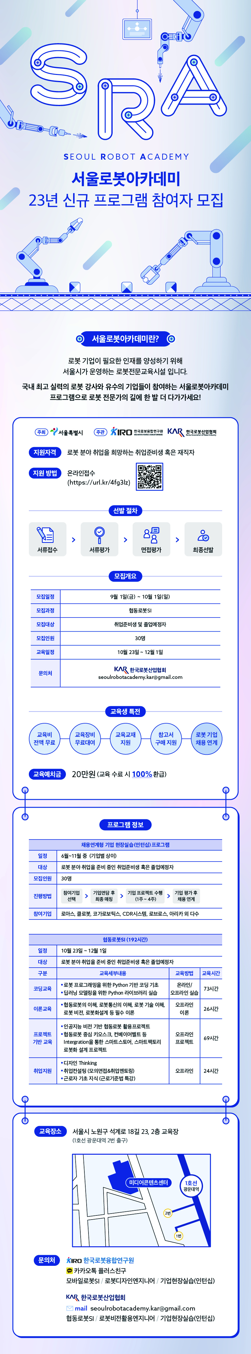 [한국로봇산업협회] 2023 서울로봇아카데미 「협동로봇SI 교육과정」 교육생 모집 홍보 관련 안내