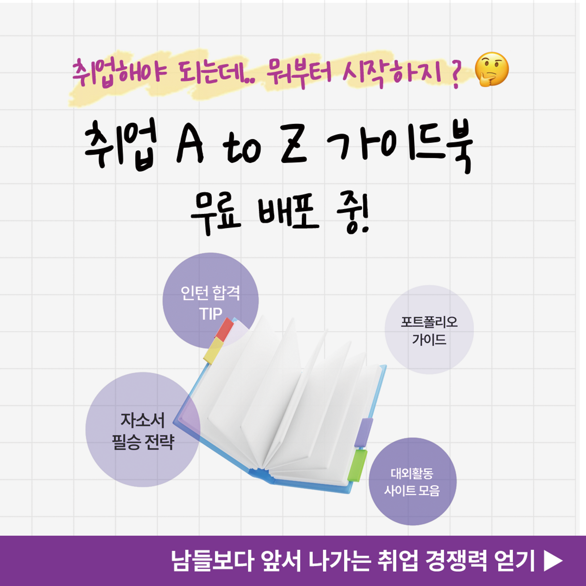 (1) 인턴 합격 팁, 포트폴리오 제작 가이드, 자기소개서 작성 팁, 대외활동 사이트 등 취업 준비에 도움이 되는 정보를 모은 가이드북