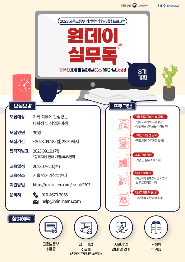 고용노동부에서 주최/주관하는 2023 '청년 일경험 지원사업 기업탐방형 일경험 프로그램 ' <원데이실무톡 8기 기획> 프로그램 안내드립니다.