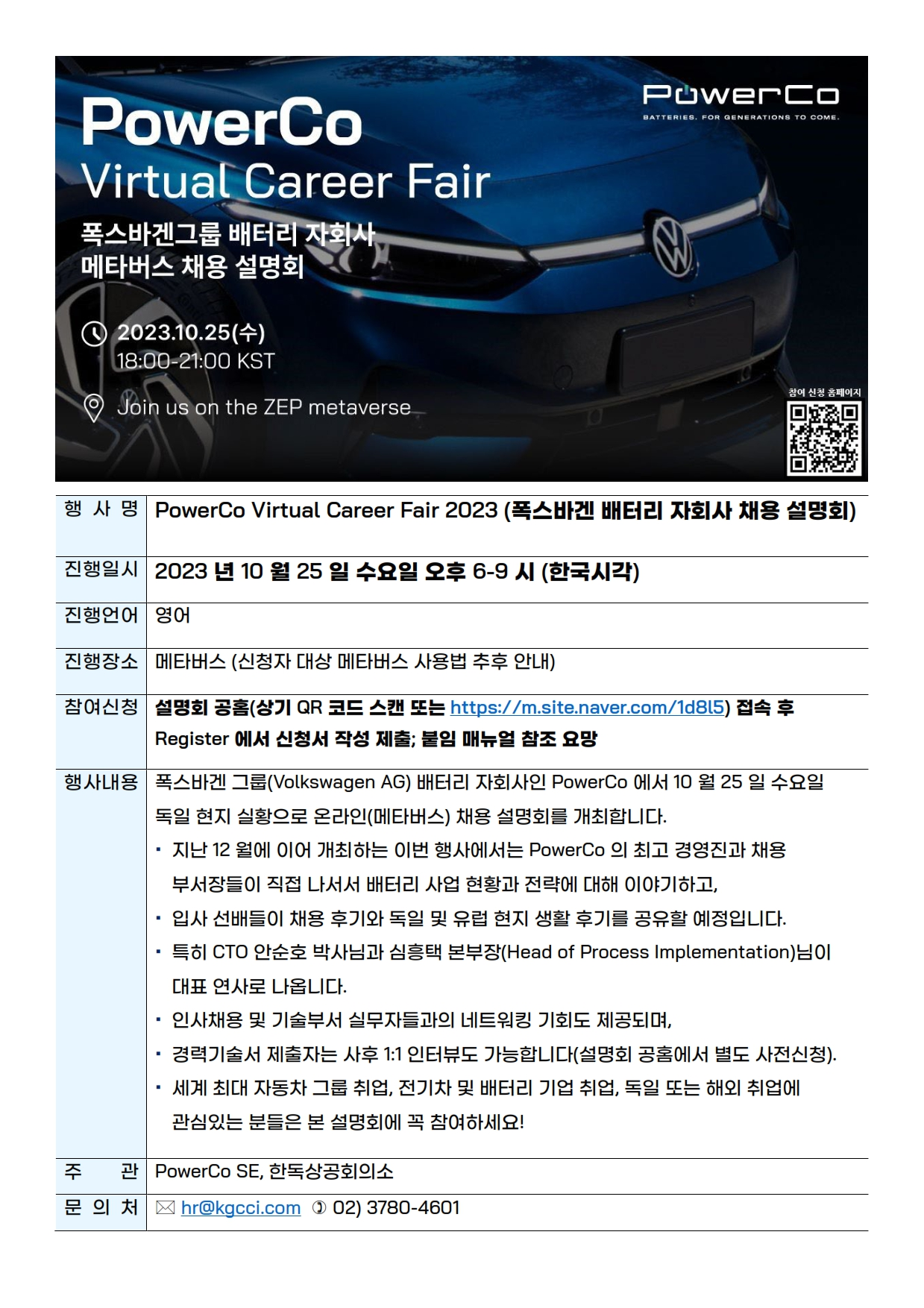 1. 행사명 : 폭스바겐 배터리 자회사 채용 설명회 (PowerCo Virtual Career Fair 2023)