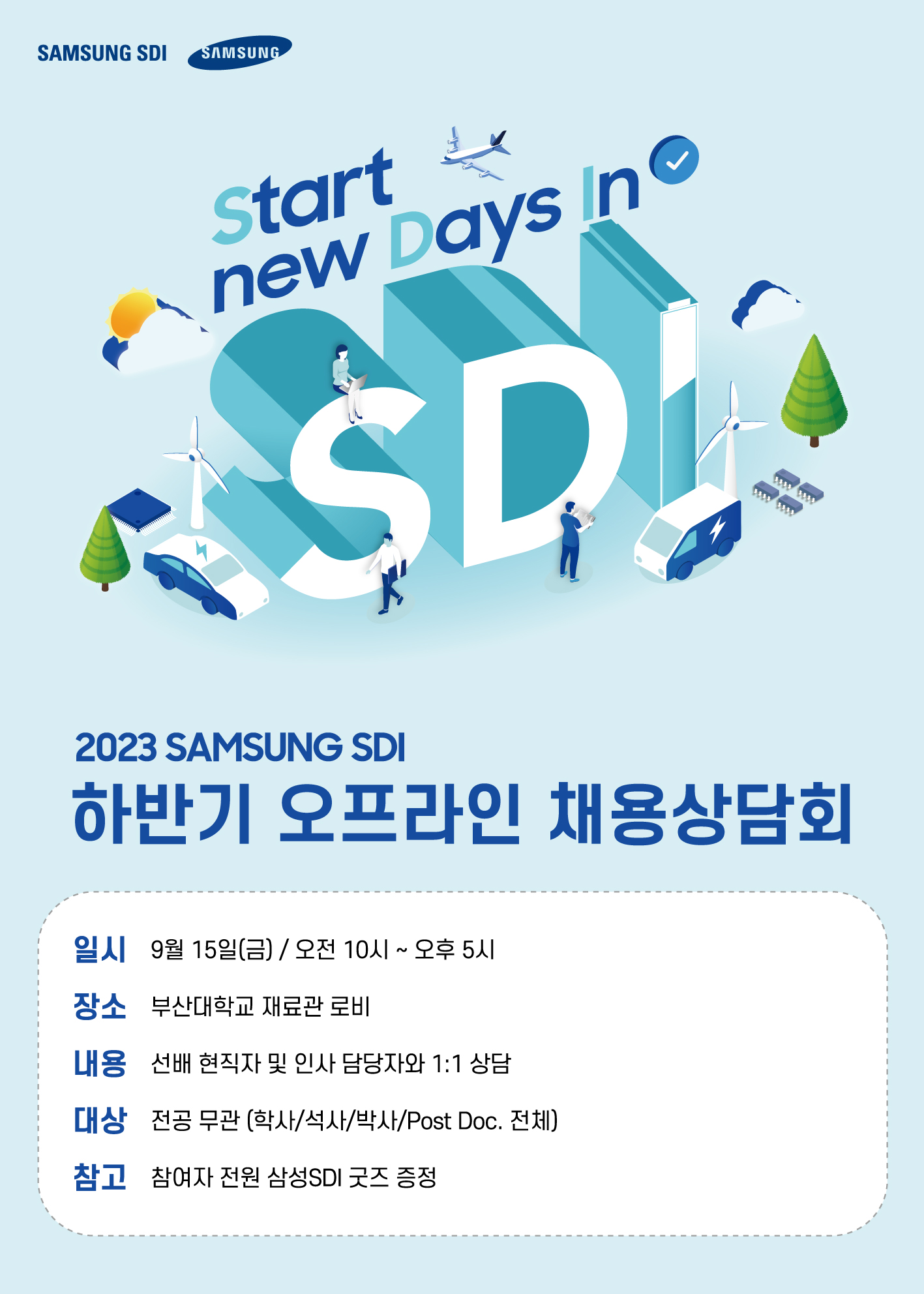 삼성SDI 2023 하반기 채용상담회 일정을 아래와 같이 알려드리니, 관심 있는 학생들의 많은 참여 바랍니다.