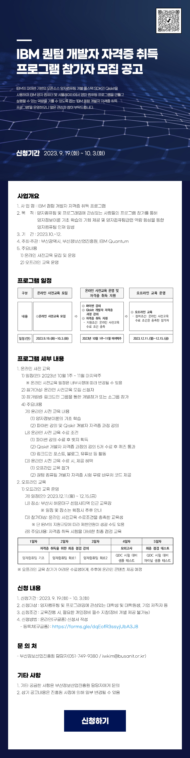 IBM의 파이썬 기반의 오픈소스 양자컴퓨팅 개발 풀스택 SDK인 Qiskit을 사용하여 IBM 양자 컴퓨터 및 시뮬레이터에서 양자 컴퓨팅 프로그램을 만들고 실행할 수 있는 역량을 기를 수 있도록 돕는 ‘IBM 퀀텀 개발자 자격증 취득 프로그램’을 운영하오니 많은 관심과 참여 부탁드립니다.