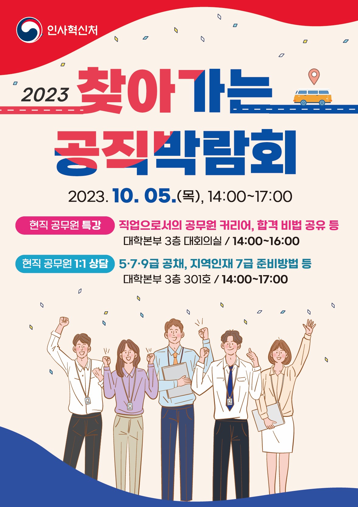 인사혁신처 찾아가는 공직박람회 일정을 아래와 같이 알려드리니, 관심 있는 학생들의 많은 참여 바랍니다.