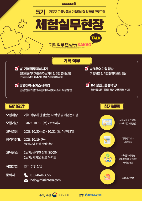 [고용노동부] 기획 직무 취업 준비 뽀개기. 카카오와 함께하는 체험실무현장 5기 기획 편 모집 중!(~10/18)