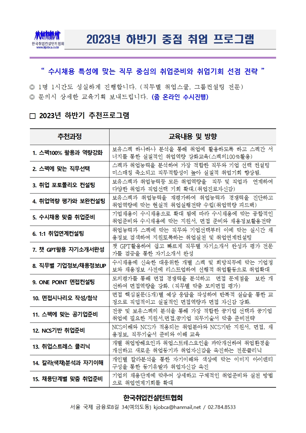 취업연계컨설팅 전문기관 한국취업컨설턴트협회에서 수시채용에 맞는 2023년 취업중점 프로그램을 진행하고 있습니다.