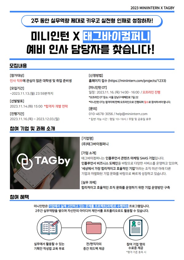 [미니인턴X태그바이컴퍼니] 인플루언서 마케팅 기업의 조직 문화 개선 과제 수행하고, 경쟁력 있는 예비 인사 담당자로 거듭나자! (~11/13)