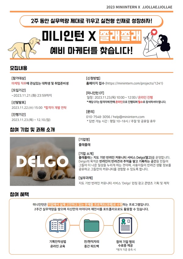 [미니인턴X쫄래쫄래] 예비 마케터주목! 반려견 서비스 ‘Delgo’의 서비스 런칭 광고 기획하고 마케팅 포트폴리오 완성!(~11/21)