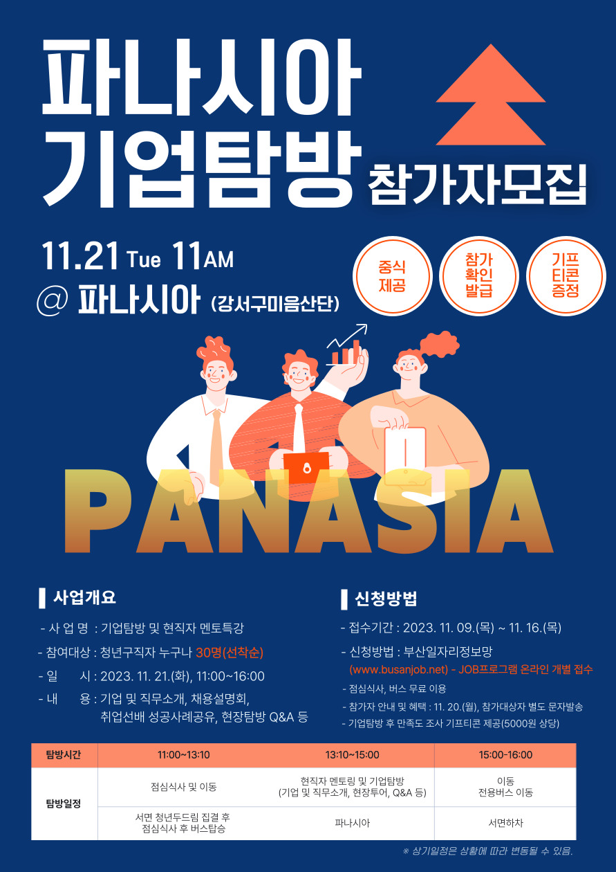 5) 신청방법 : 부산일자리정보망 < job프로그램(기업탐방) 개별신청 (https://www.busanjob.net/03_part/part01_view.asp?idx=9615&page=1¶ms=)