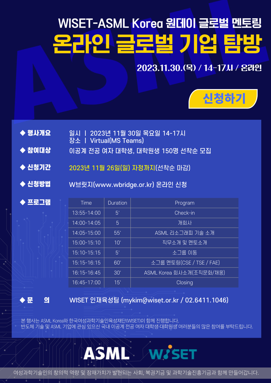1. 프로그램 명 : WISET-ASML Korea 원데이 글로벌 멘토링 '온라인 글로벌 기업 탐방'