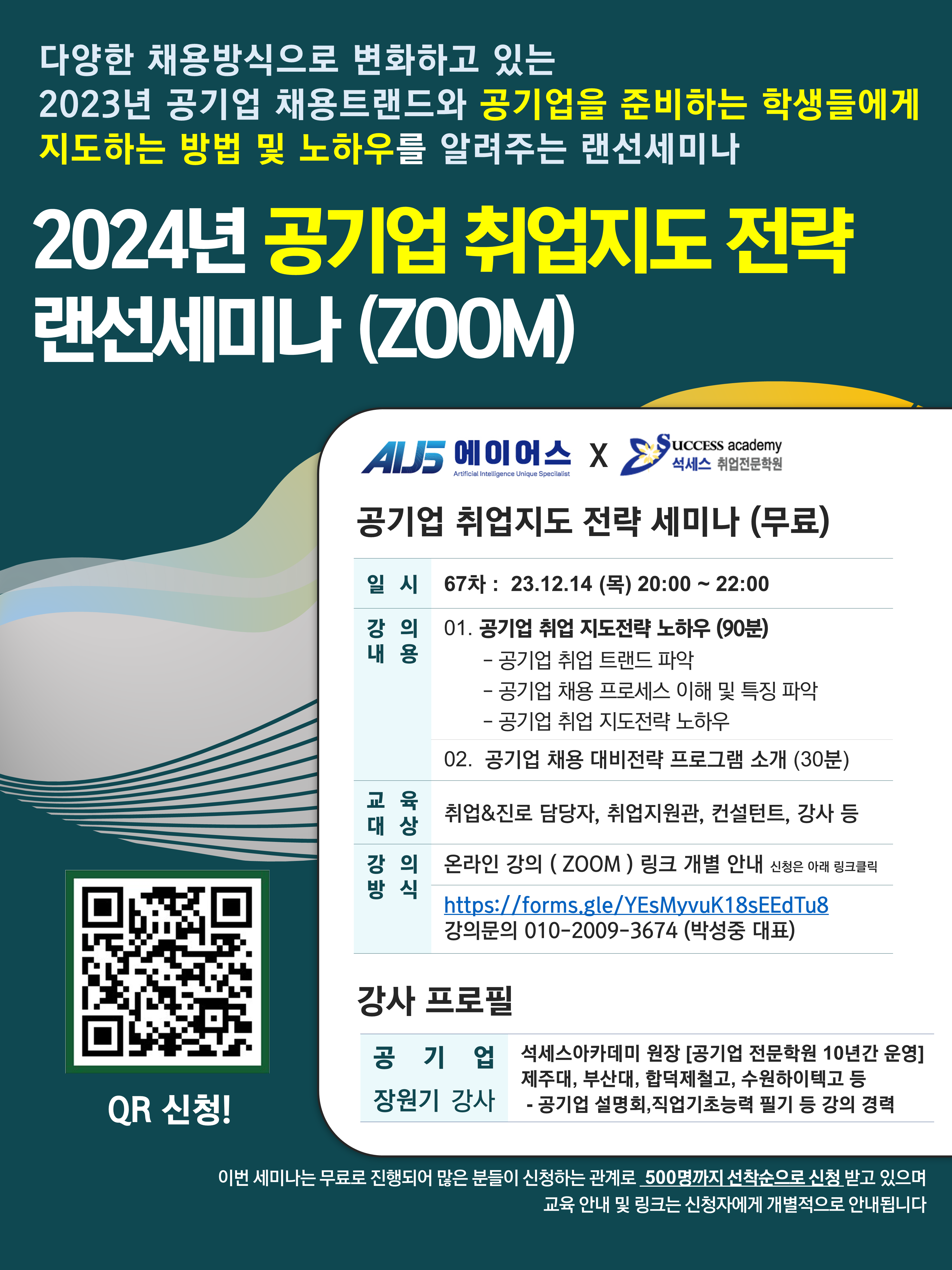랜선세미나 67차 24년 공기업 취업지도 전략 (온라인) 무료 초대장 (12.14 목, 20시)