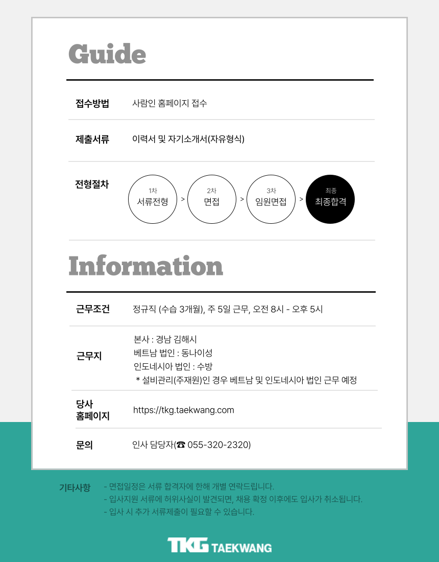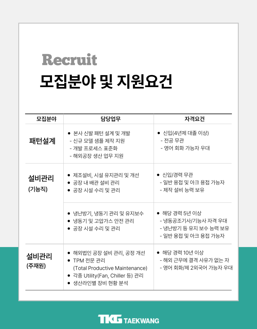 TKG태광 채용설명회 일정을 아래와 같이 알려드리니, 관심 있는 학생들의 많은 참여 바랍니다.