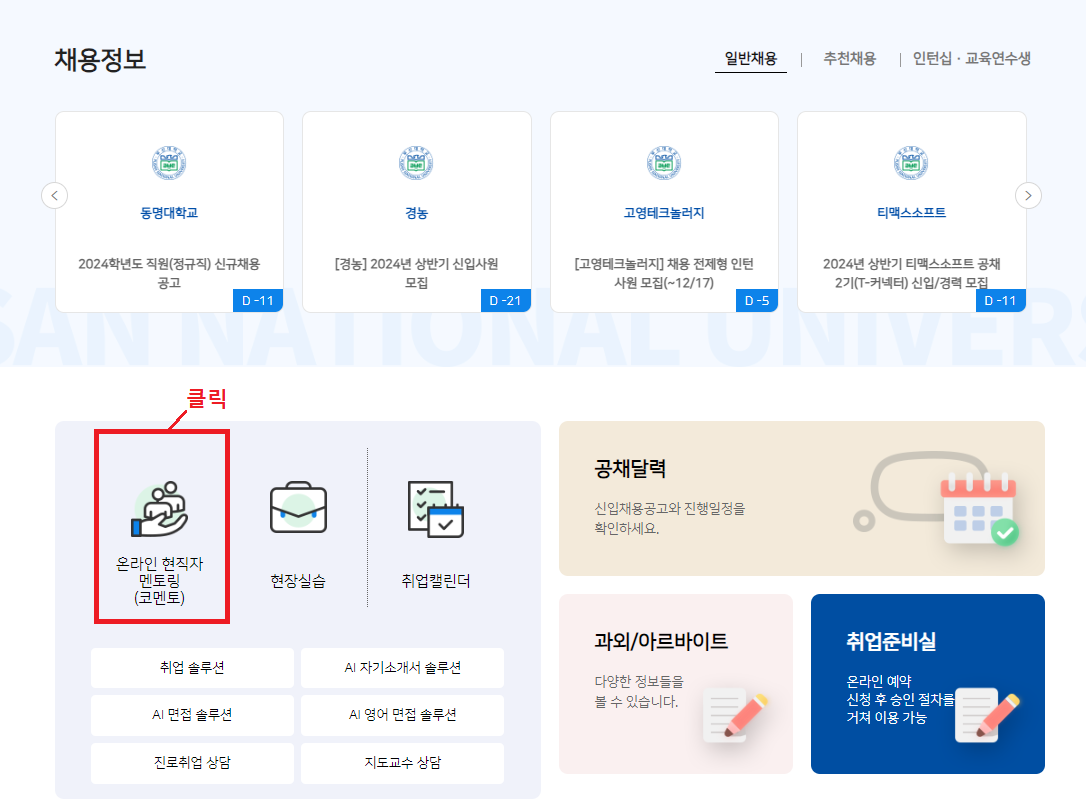 취업전략과 홈페이지 첫화면의 연결 링크(아래 화면 참고)를 통해 이용이 가능하며, 붙임 매뉴얼을 통해 이용방법 등을 확인해주시기 바랍니다.