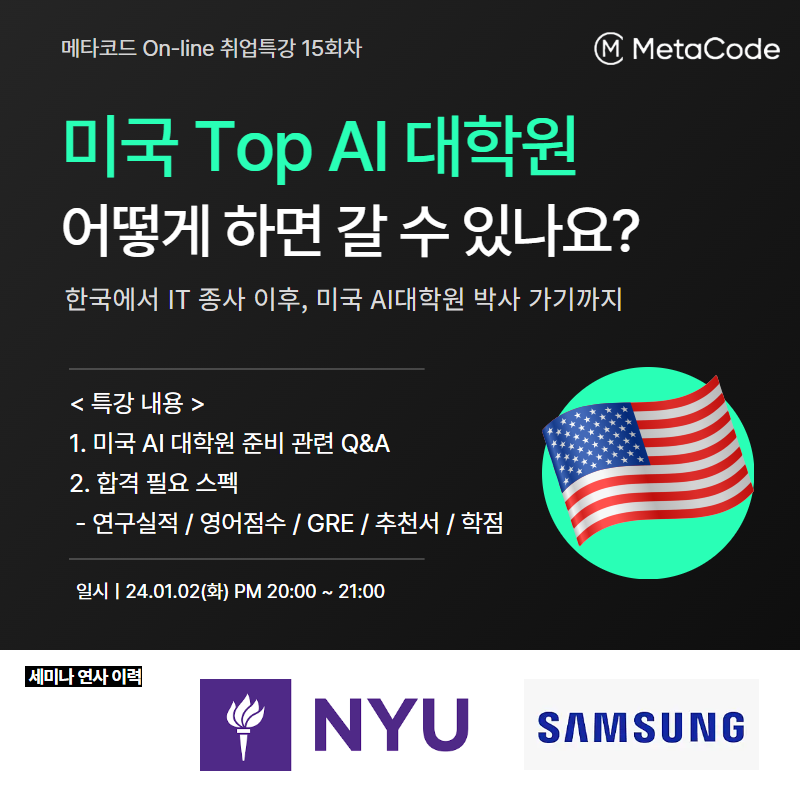 🚀(무료/선착순 500명) 미국 Top AI 대학원 진학 고민하시는 대학생 분들을 초대합니다