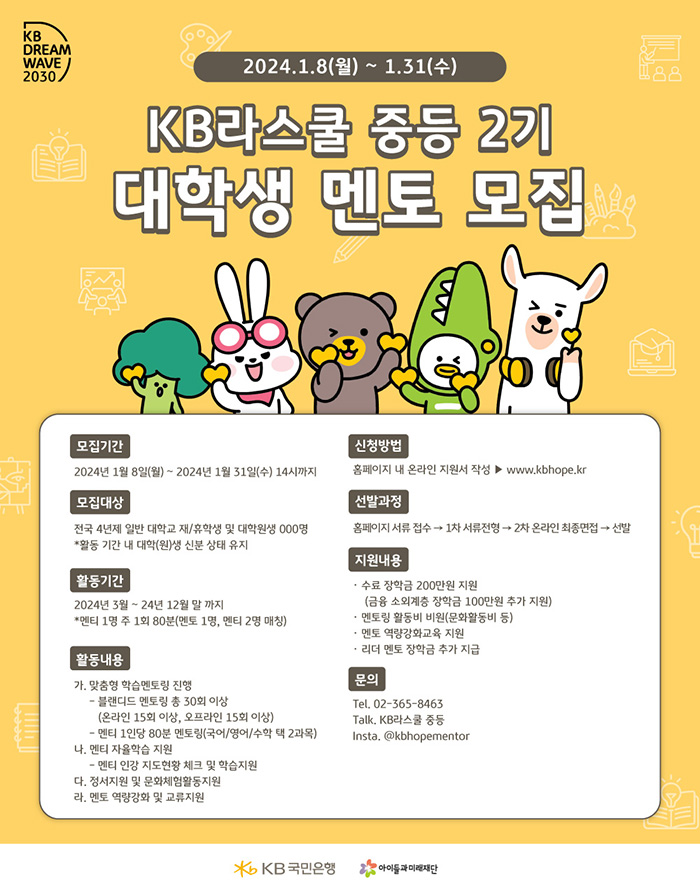 [KB국민은행] KB라스쿨 중등 2기 대학생 멘토 모집 (~1/31)