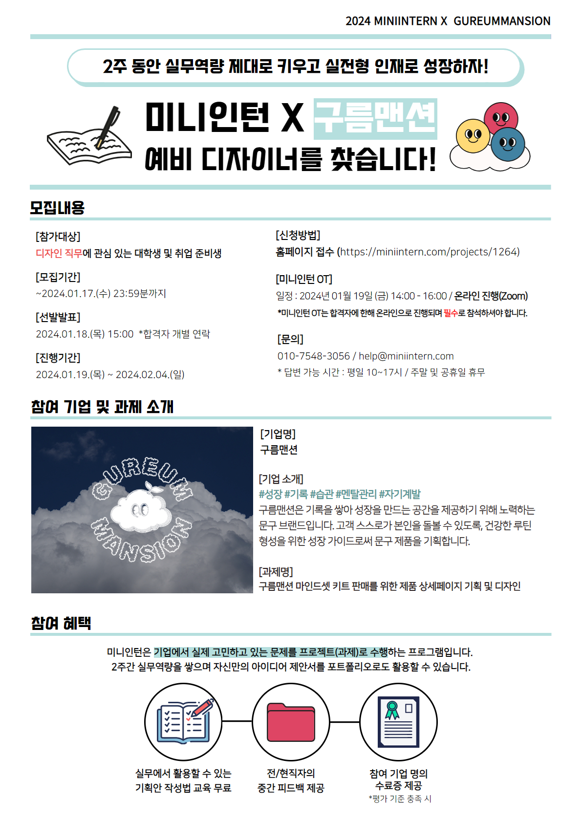 [미니인턴X구름맨션] ‘성장’에 진심인 브랜드 ‘구름맨션’의 다이어리 상세페이지 제작하고, 브랜드 디자인 포트폴리오 완성! (~01/17)