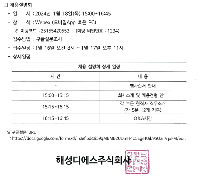 2024년 해성디에스 대졸 신입사원 비대면 채용설명회 홍보