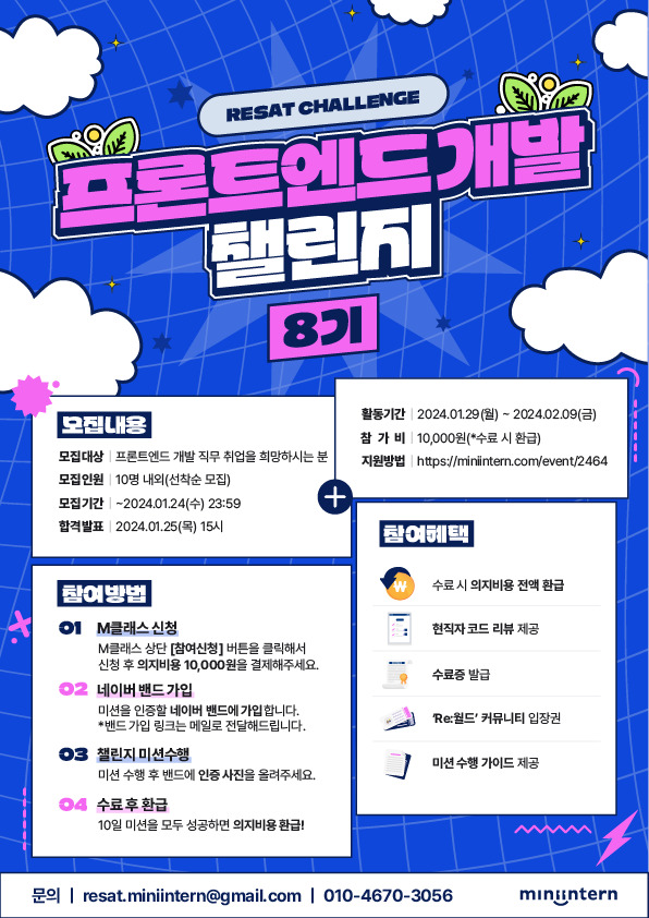 - 참가 비용 : 유료 (의지 비용 10,000원) *수료 시, 의지 비용 환급 예정