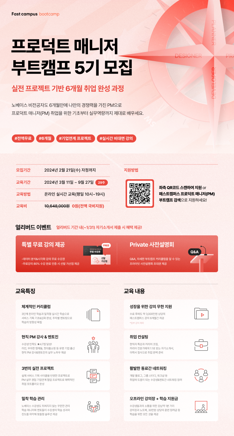 [패스트캠퍼스] [전액무료] 비전공자/문과생을 위한 PM 취업 올인원 부트캠프 5기 모집