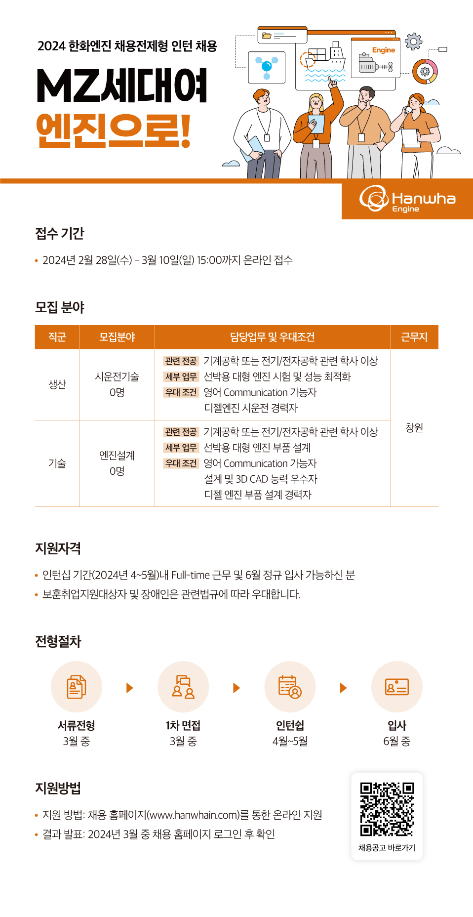 한화엔진 2024 상반기 채용상담회 일정을 아래와 같이 알려드리니, 관심 있는 학생들의 많은 참여 바랍니다.
