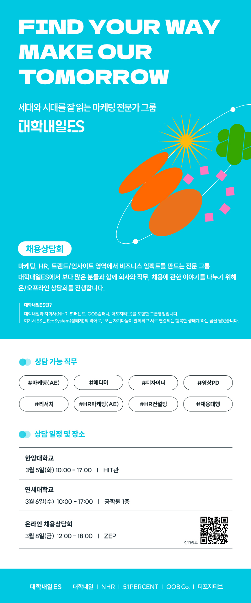 마케팅, 트렌드/인사이트, HR/조직문화 영역에서 솔루션을 제공하는 종합 마케팅 에이전시 대학내일ES가 채용상담회를 진행합니다.