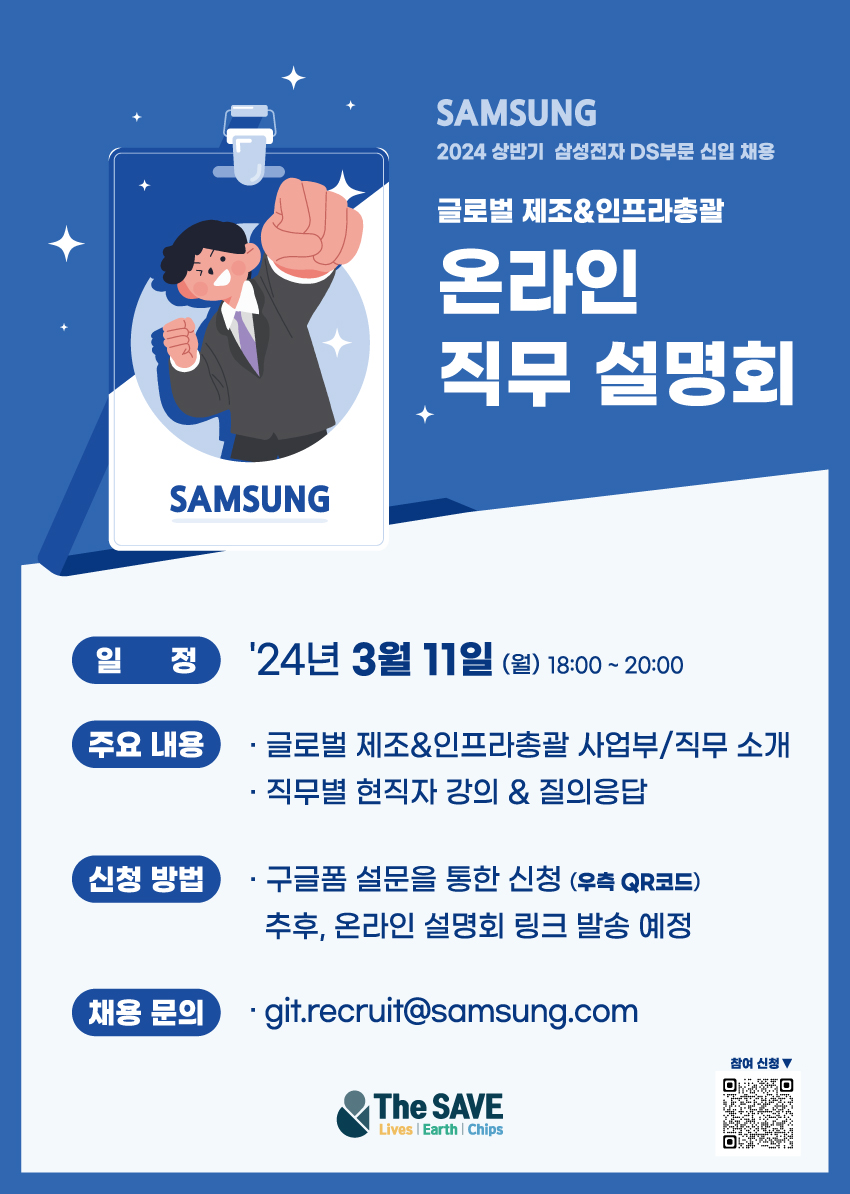 [삼성전자 DS] 글로벌 제조&인프라총괄 온라인 직무설명회 안내 (3.11(월), 18:00~20:00)