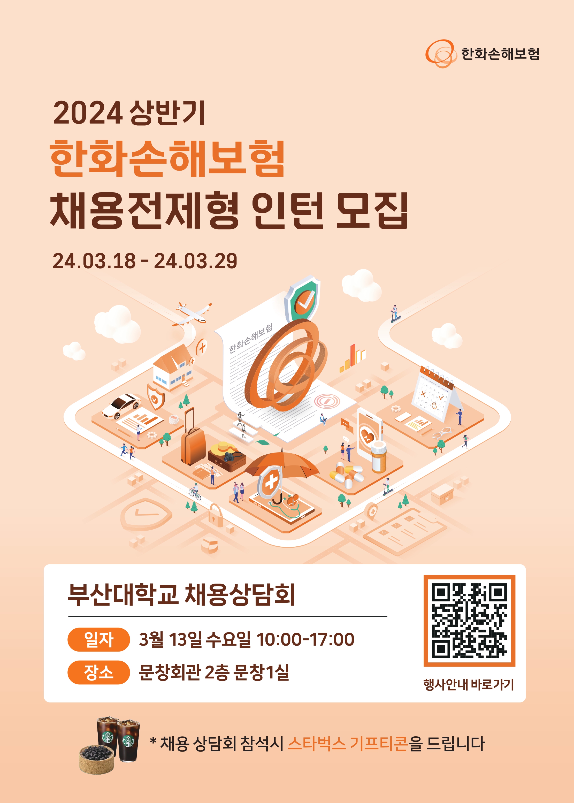 한화손해보험 2024 상반기 채용상담회 일정을 아래와 같이 알려드리니, 관심 있는 학생들의 많은 참여 바랍니다.