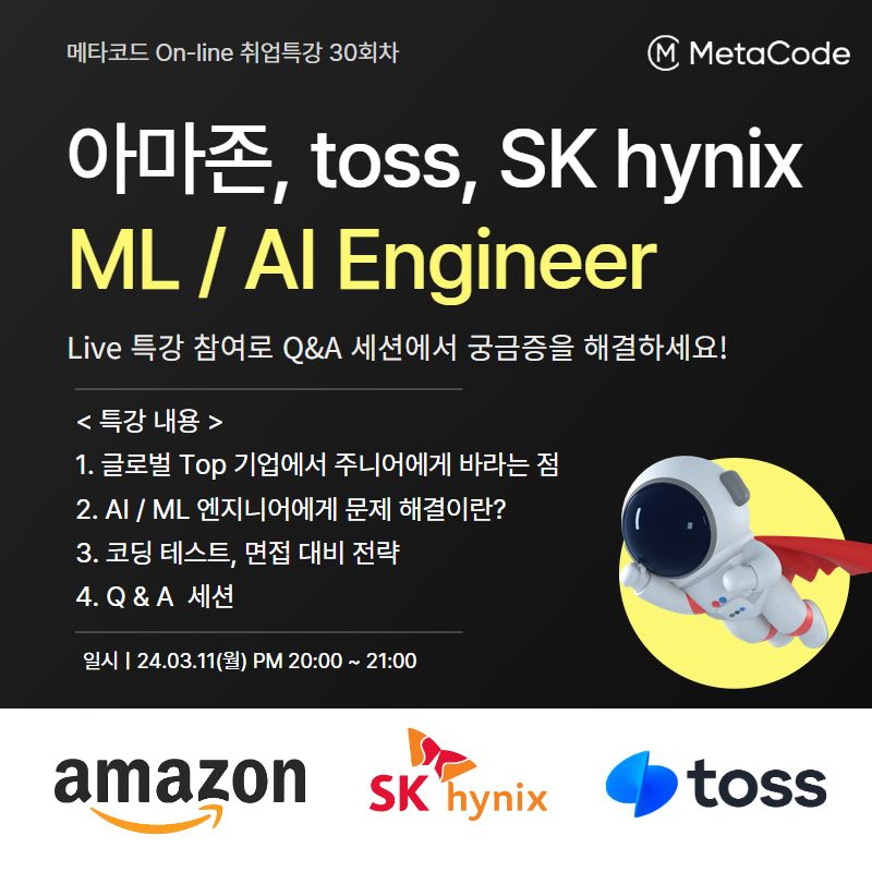 [무료/선착순300명] 아마존, 토스, SK ML/AI 엔지니어 현직자( Live (취업/ 커리어) 특강