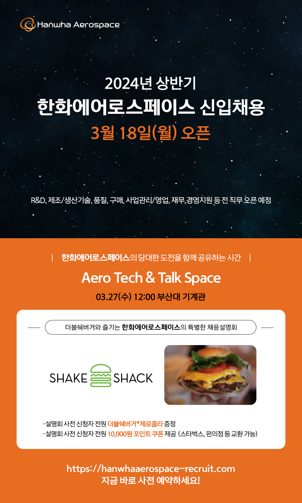 📌[한화에어로스페이스] 더블쉑버거와 즐기는 런치 채용설명회 (만원 상당 선물은 덤)