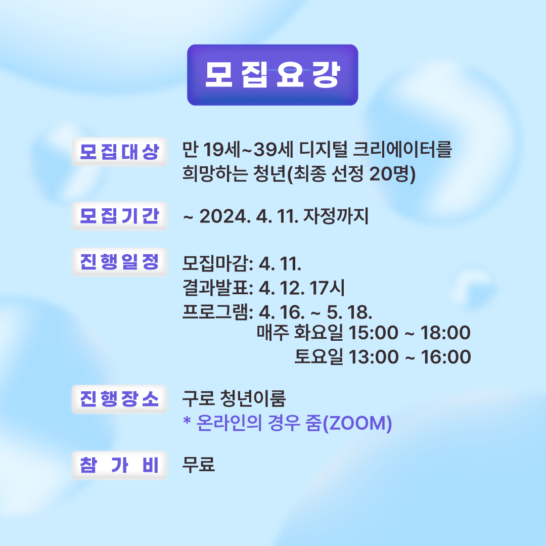 - 합격자 발표 : 2024.04.12 17시 (청년이룸 홈페이지 공지)