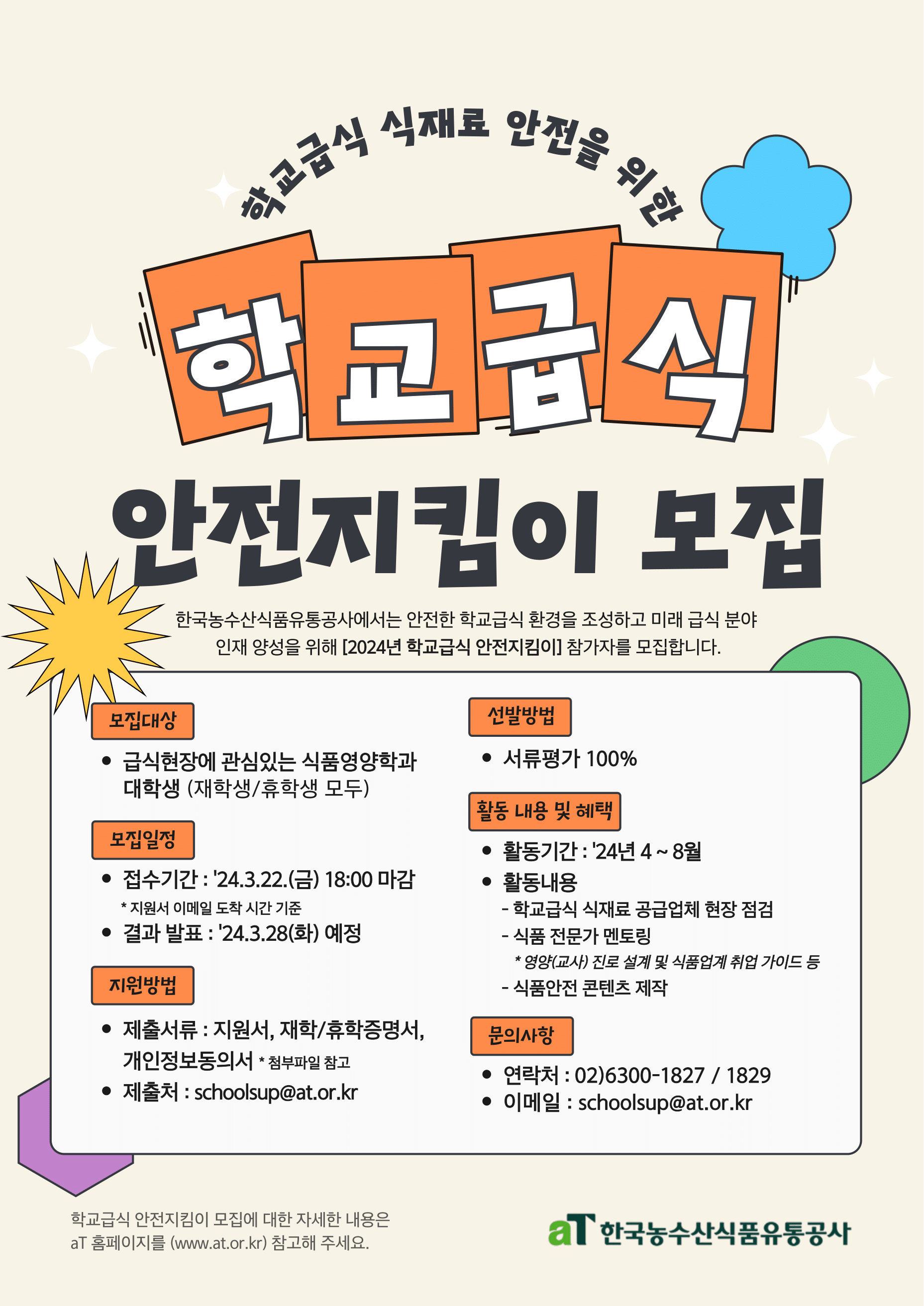 「2024년 학교급식 안전지킴이(예비 영양사 점검단)」참가자 모집