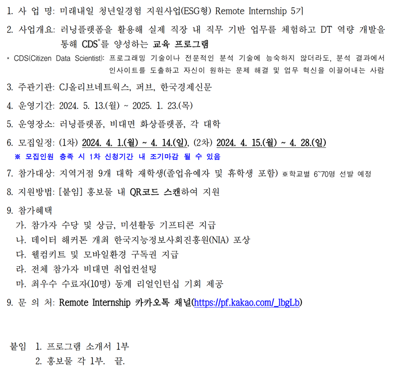 미래내일 청년일경험 지원사업(ESG형) Remote Internship 5기 참가자 모집을 아래와 같이 알려드리니, 관심 있는 학생들의 많은 지원 바랍니다.