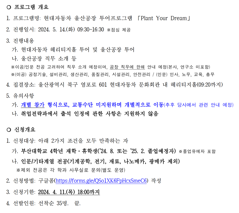 현대자동차 울산공장 투어프로그램 「Plant Your Dream」에 대해 아래와 같이 안내하니, 관심 있는 학생들의 많은 참여 바랍니다.
