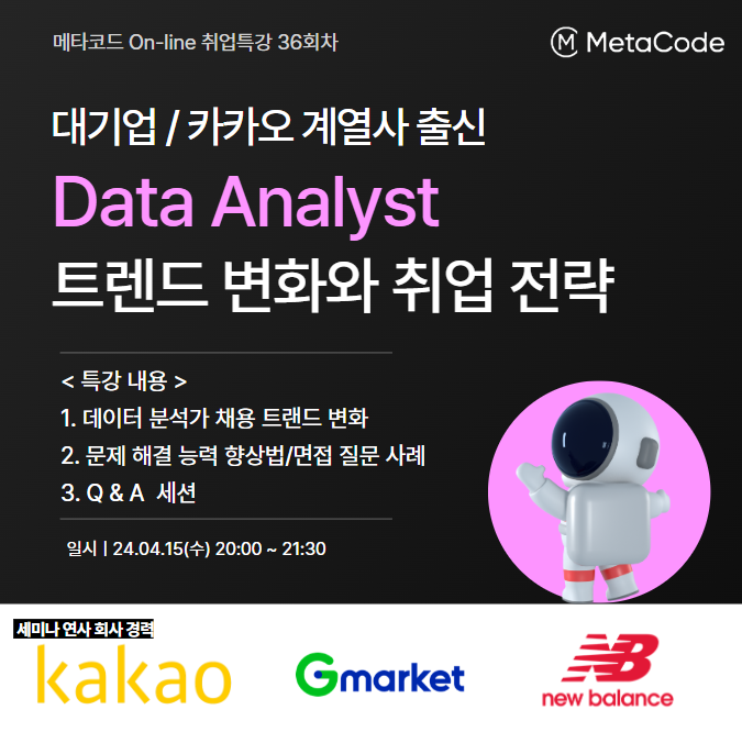 [무료/선착순 200명] 대기업/ 카카오 계열사 출신 데이터 분석가 Live 취업 전략 특강(4/17)