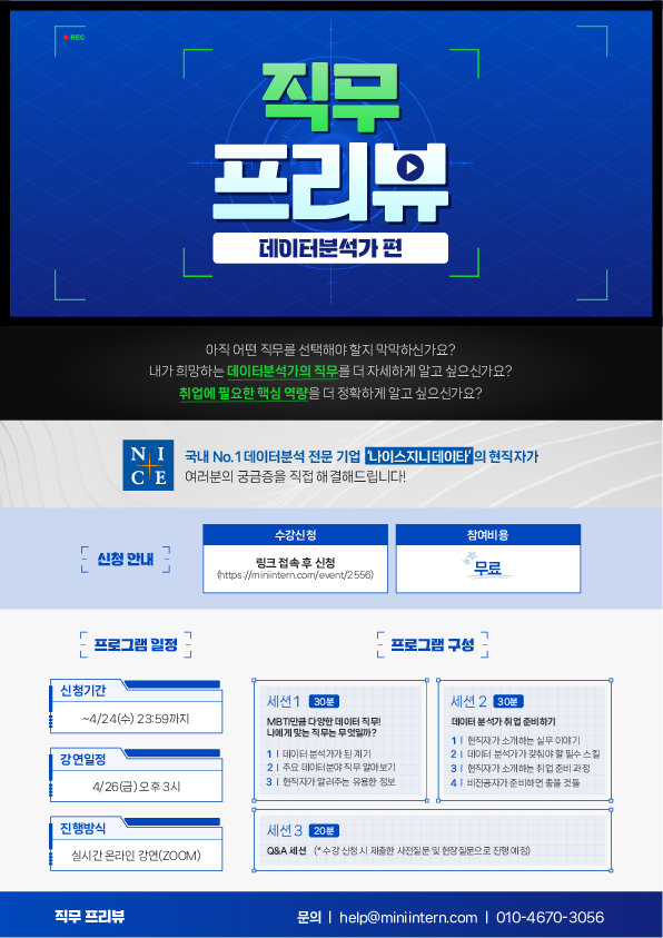 국내 데이터분석 분야의 No.1 기업, 나이스지니데이타의 현직 전문가들이 직접 여러분을 만나 이 모든 궁금증을 해결해드립니다!