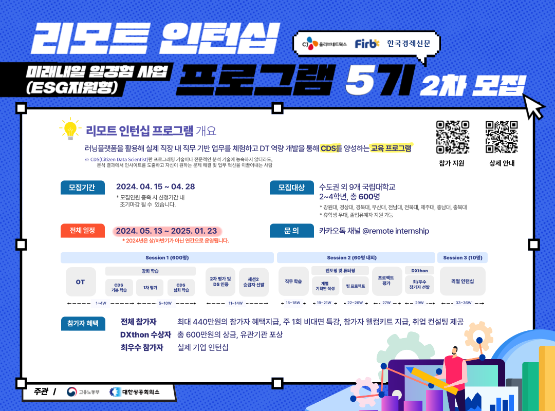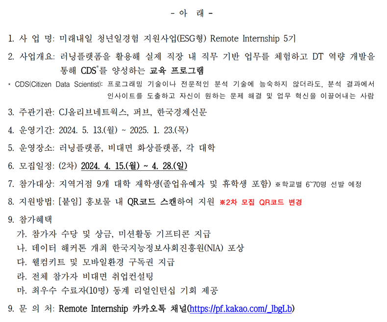 미래내일 청년일경험 지원사업(ESG형) Remote Internship 5기 참가자 2차 모집을 아래와 같이 알려드리니, 관심 있는 학생들의 많은 지원 바랍니다.