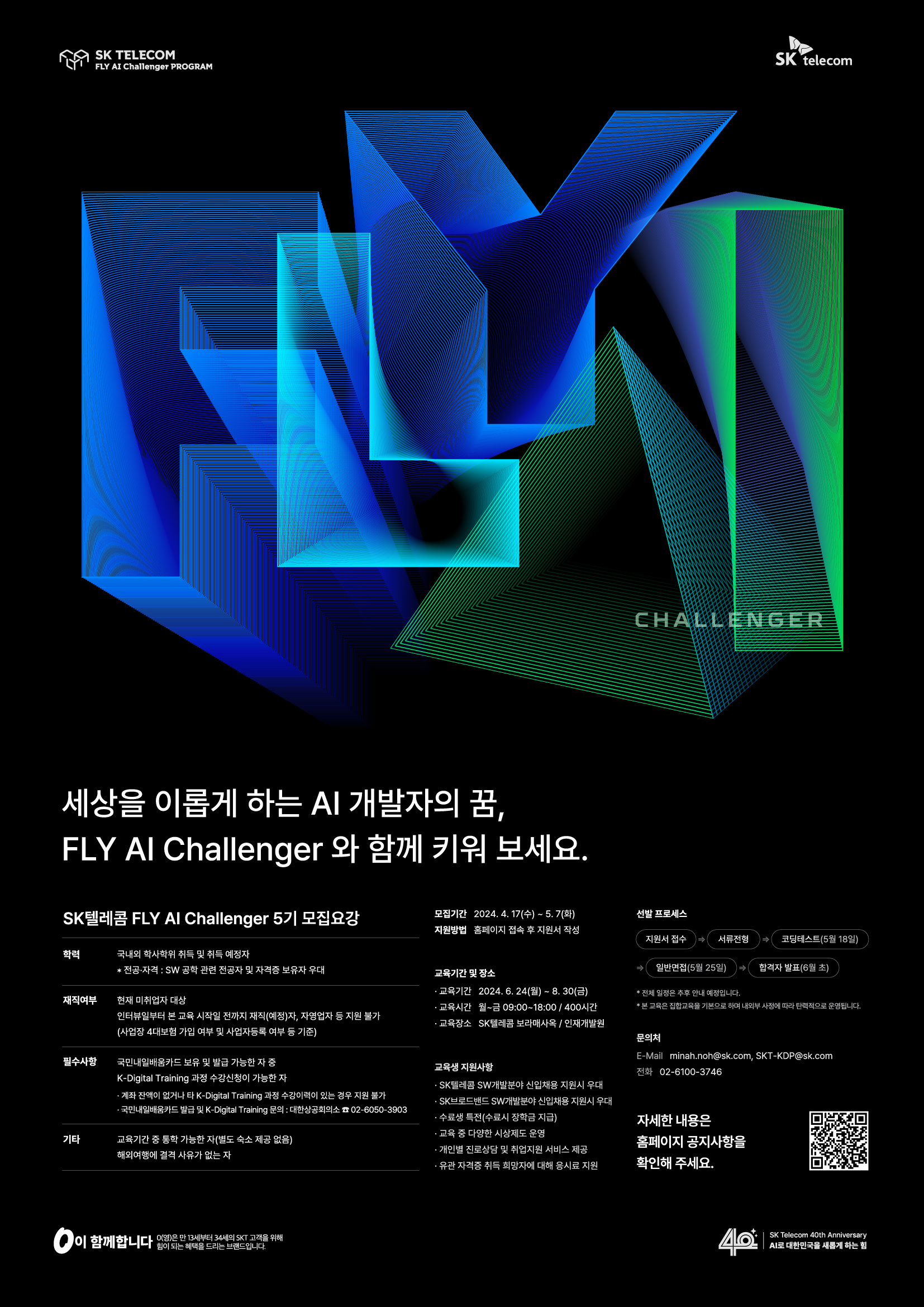 [SK텔레콤] FLY AI 5기 | 4.17.(수) ~ 5.7.(화) | 2024년 6월 24일 ~ 2024년 8월 30일 | SK텔레콤 보라매사옥 / 인재개발원 |