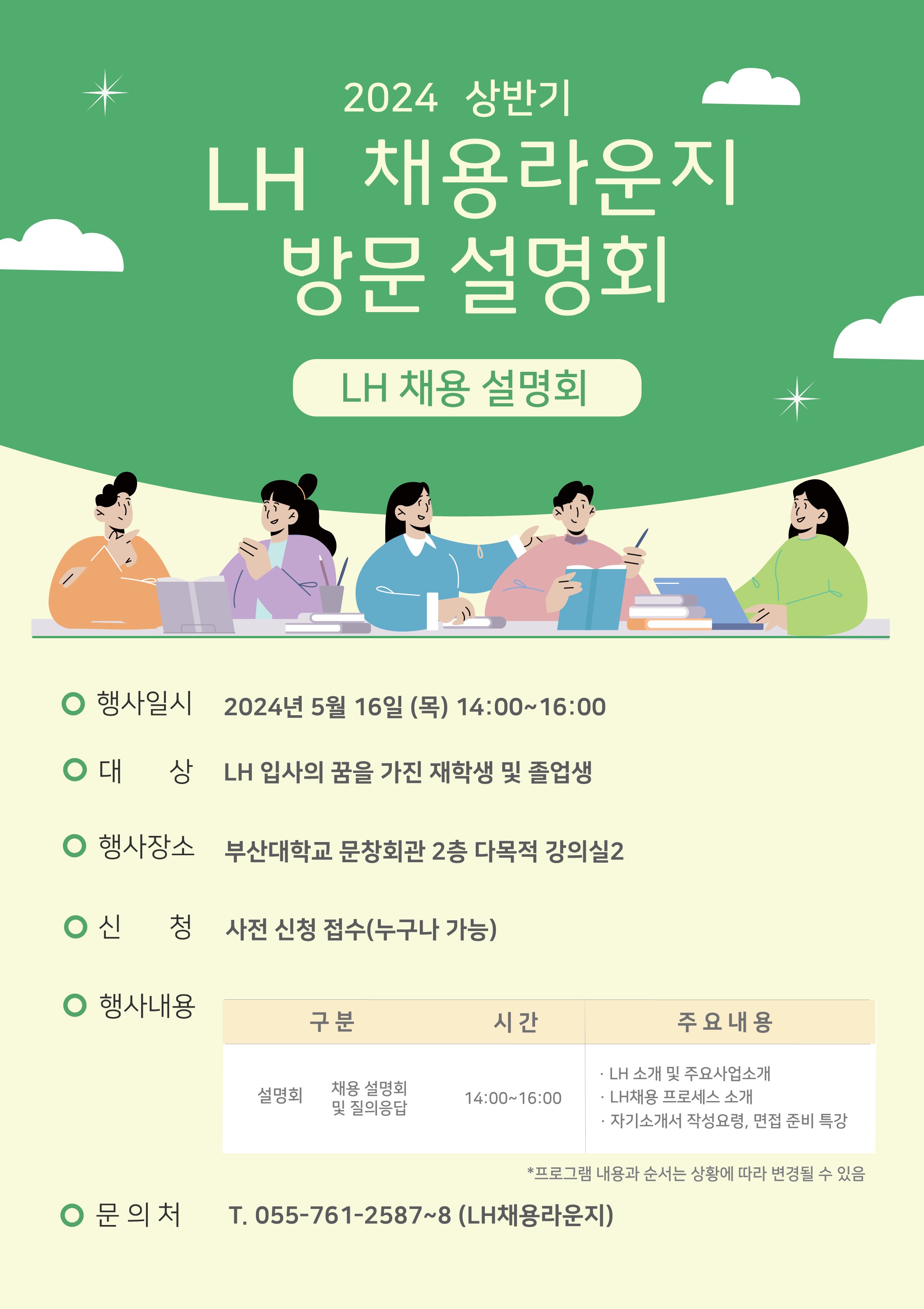 LH한국토지주택공사 2024 상반기 채용설명회 일정을 아래와 같이 알려드리니, 관심 있는 학생들의 많은 참여 바랍니다.