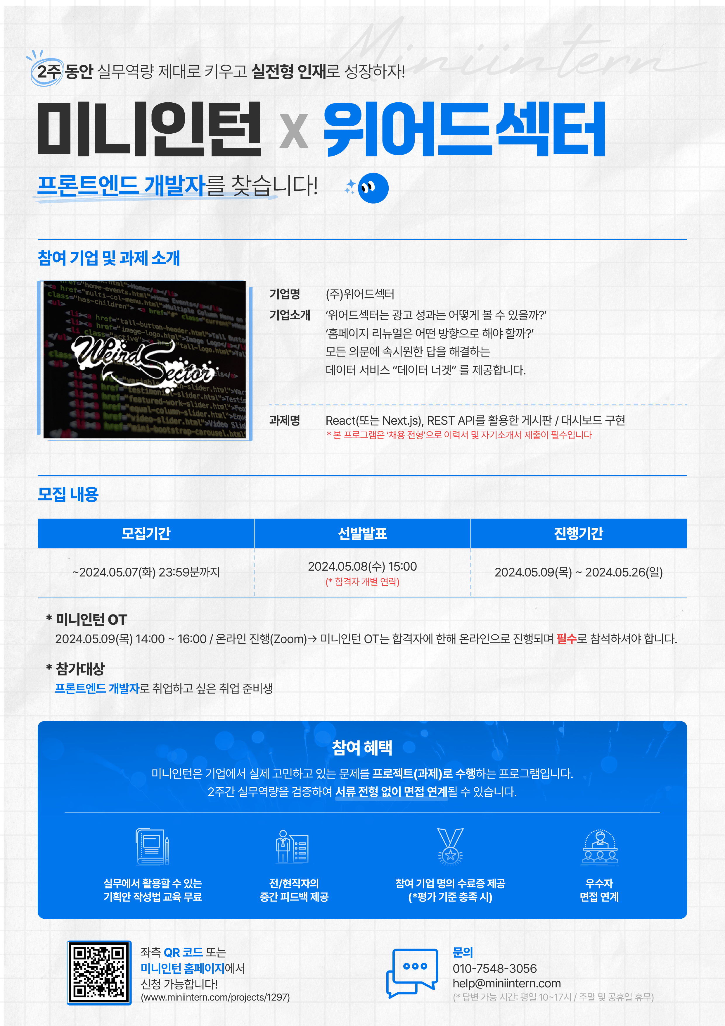 [미니인턴X위어드섹터] 👩🏻💻"아~코딩하고 싶다~알 수 없는 버그로 밤새고 싶다~!" 프론트엔드 개발자 인턴 취업하고 싶은 사람 모여라(~05/07)
