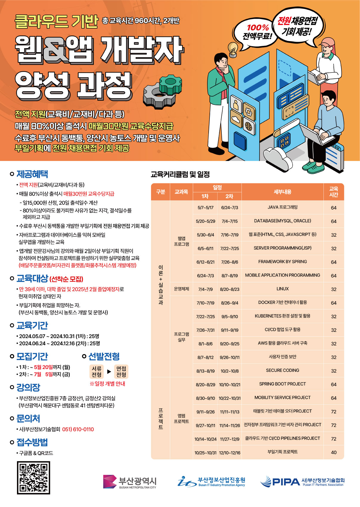 클라우드 기반 웹&앱 개발자 양성 과정(교육생모집) > 알려드립니다. | (사)부산정보기술협회 (pipa.or.kr)