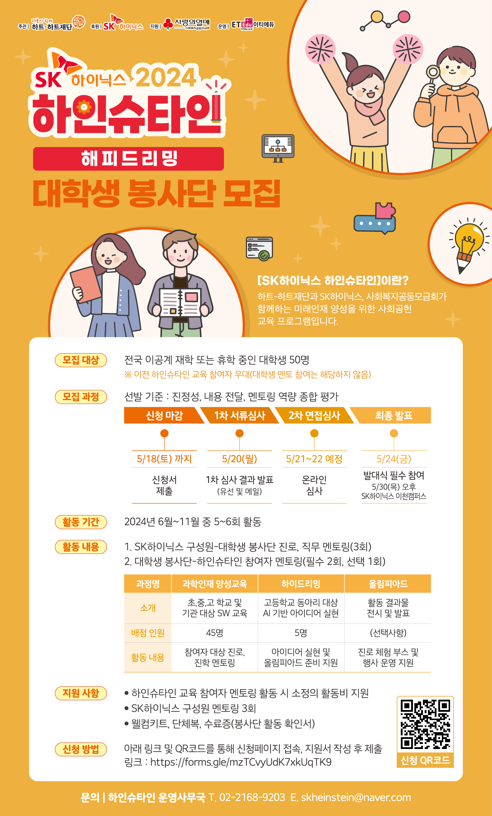 SK하이닉스 2024 하인슈타인 [해피드리밍] 대학생 봉사단 모집(~5/18 까지)