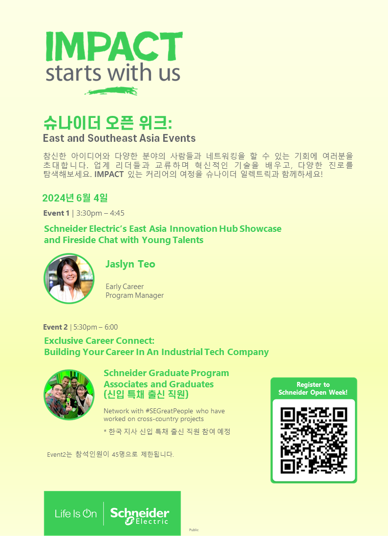 Schneider Open Week 2024의 첫번째 행사를 소개합니다. 이번 행사를 통해 여러분의 커리어, 전문 기술, 역량, 인적 네트워크를 강화할 수 있습니다 😊