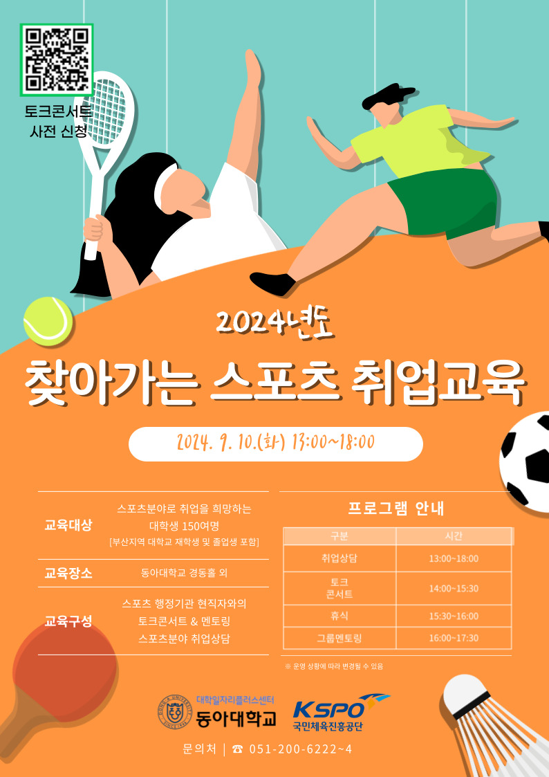 동아대학교 대학일자리플러스센터와 국민체육진흥공단 스포츠산업일자리센터는 부산지역 청년 및 대학생의 스포츠 산업 분야 취업역량 강화를 위하여 아래와 같이「2024년 찾아가는 스포츠 취업 교육 프로그램」을 운영합니다.