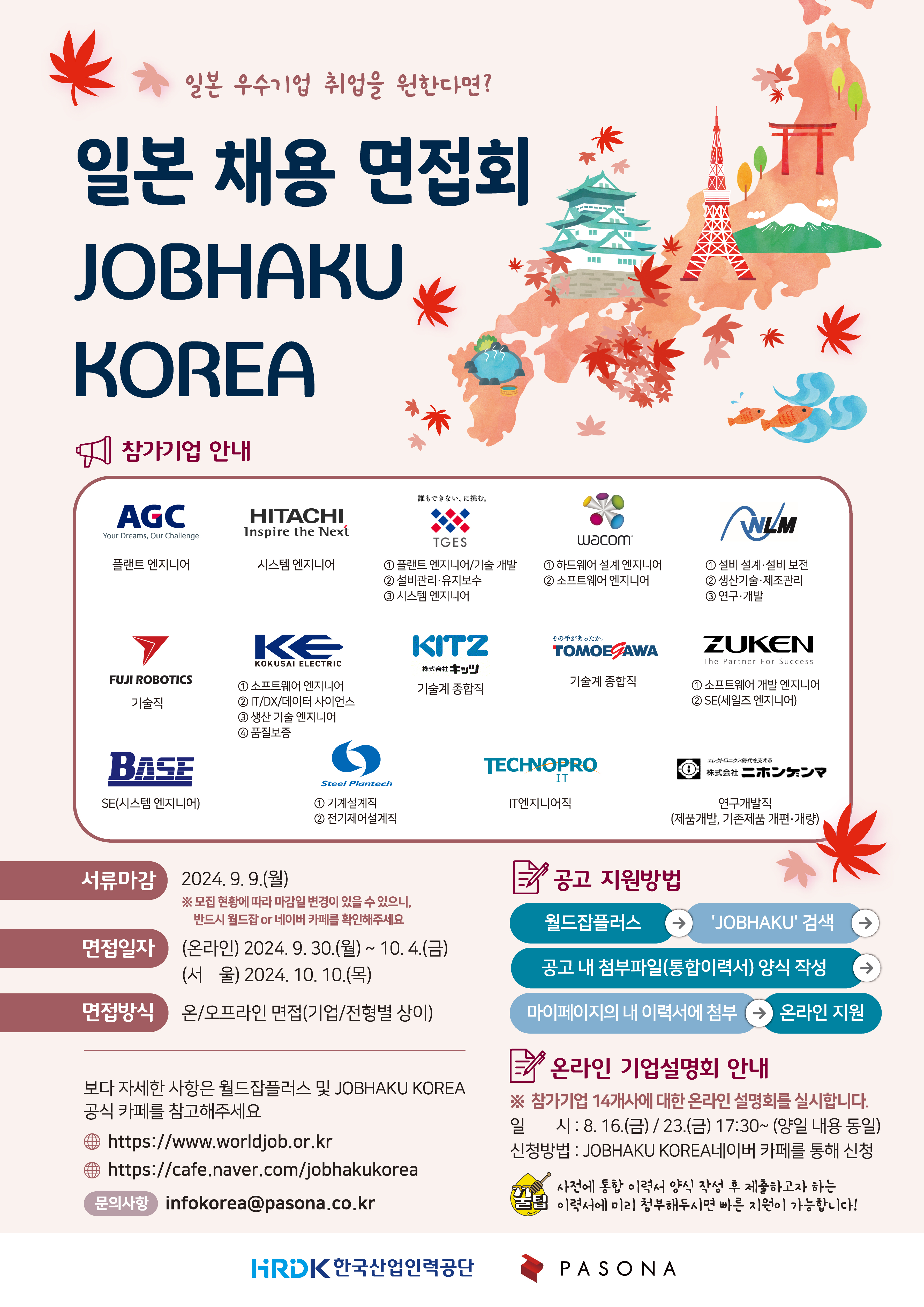 일본 해외진출을 희망하는 구직자를 위해 일본 채용면접회(JOBHAKU KOREA)를 다음과 같이 개최하오니, 많은 관심 부탁드립니다.