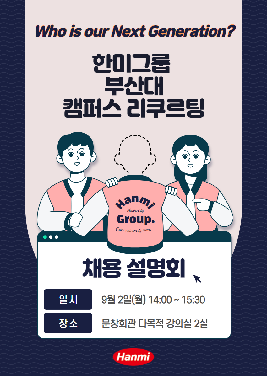 한미그룹 채용설명회 일정을 아래와 같이 알려드리니. 많은 학생들의 참여 바랍니다.