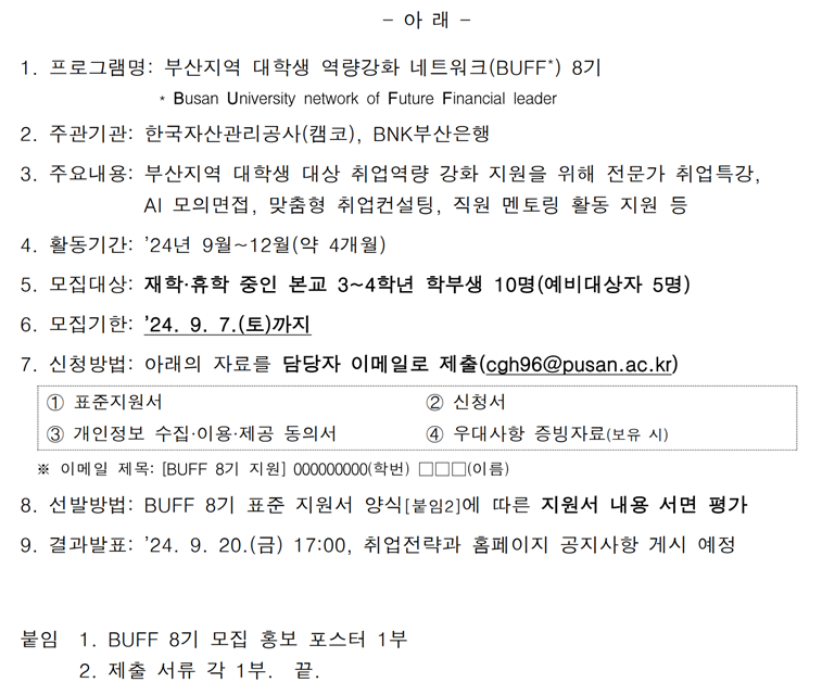 한국자산관리공사와 BNK부산은행에서 주관하는 2024년 부산지역 대학생 역량강화 네트워크(BUFF) 8기 참여자를 아래와 같이 모집하니, 관심 있는 학생들의 많은 지원 바랍니다.
